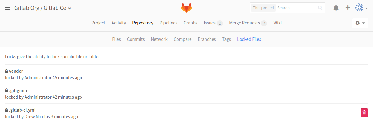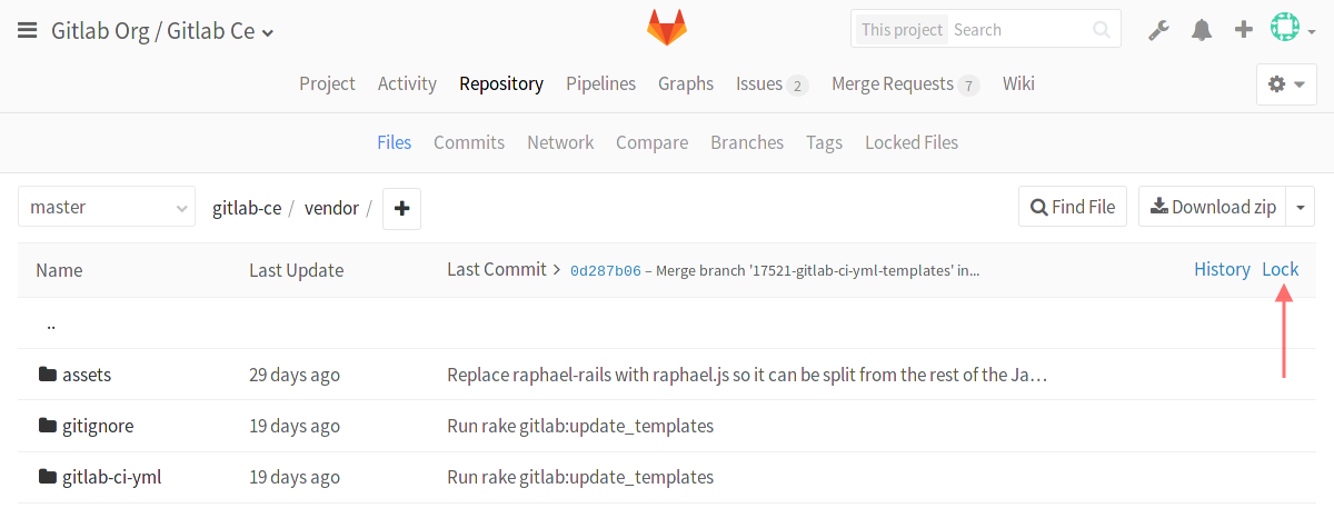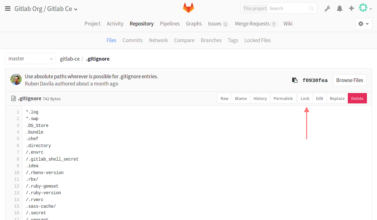 Note: Locking only works for the default branch you have set in the project's settings (usually master).